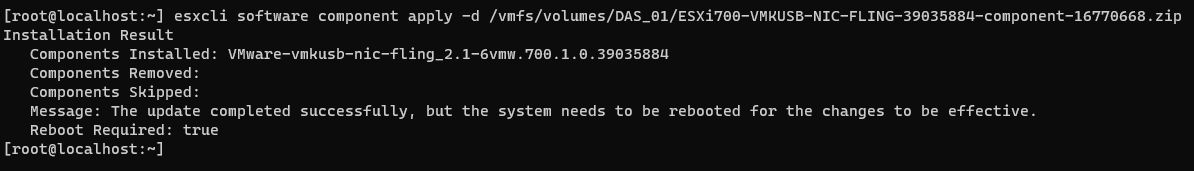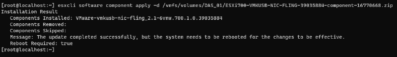 # esxcli software component apply -d /vmfs/volumes/DAS_01/ESXi700-VMKUSB-NIC-FLING-39035884-component-16770668.zipPronto, conecte o adaptador e reinicie o ESXi.