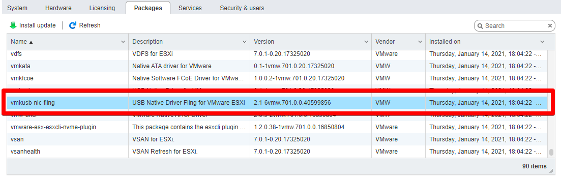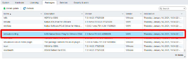 # esxcli software vib install -d /CAMINHO/PACOTEDepois de reiniciar podemos verificar se o pacote foi instalado corretamente.