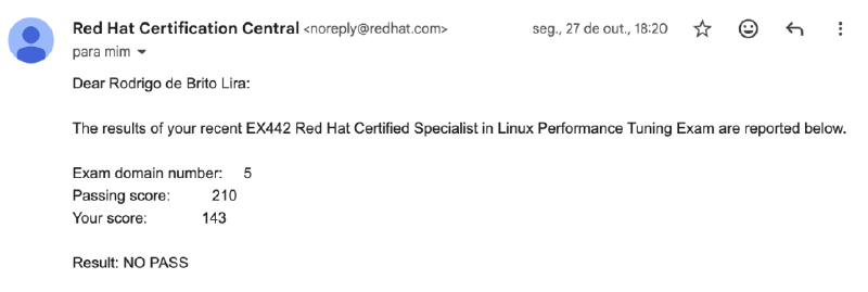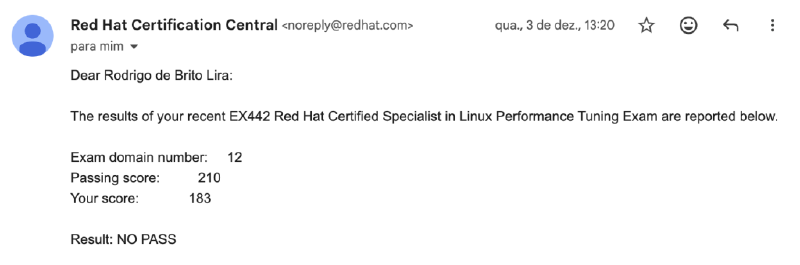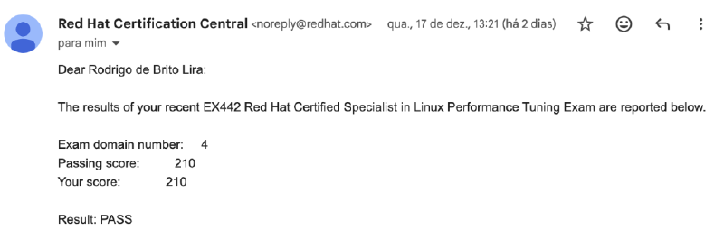 Muitas pessoas consideram o EX442 o exame mais difícel da Red Hat, o que torna essa conquista ainda mais especial. Estou extremamente satisfeito por encerrar 2025 com o resultado que tanto sonhava.