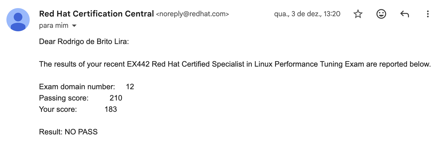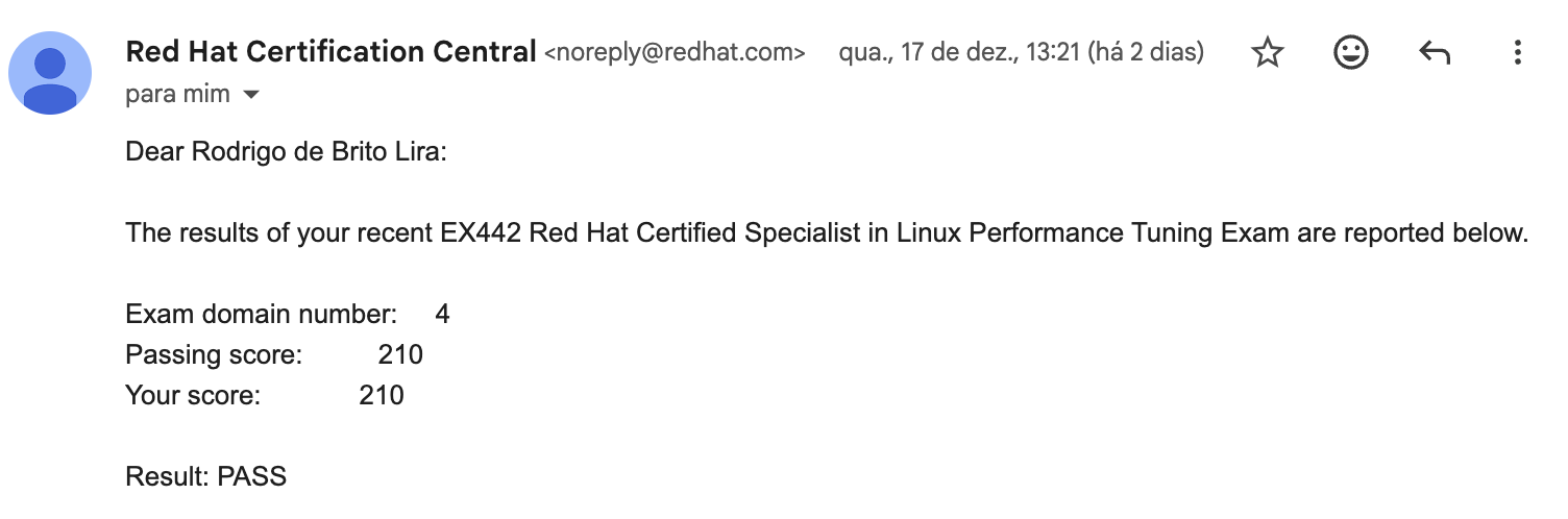 Muitas pessoas consideram o EX442 o exame mais difícel da Red Hat, o que torna essa conquista ainda mais especial. Estou extremamente satisfeito por encerrar 2025 com o resultado que tanto sonhava.