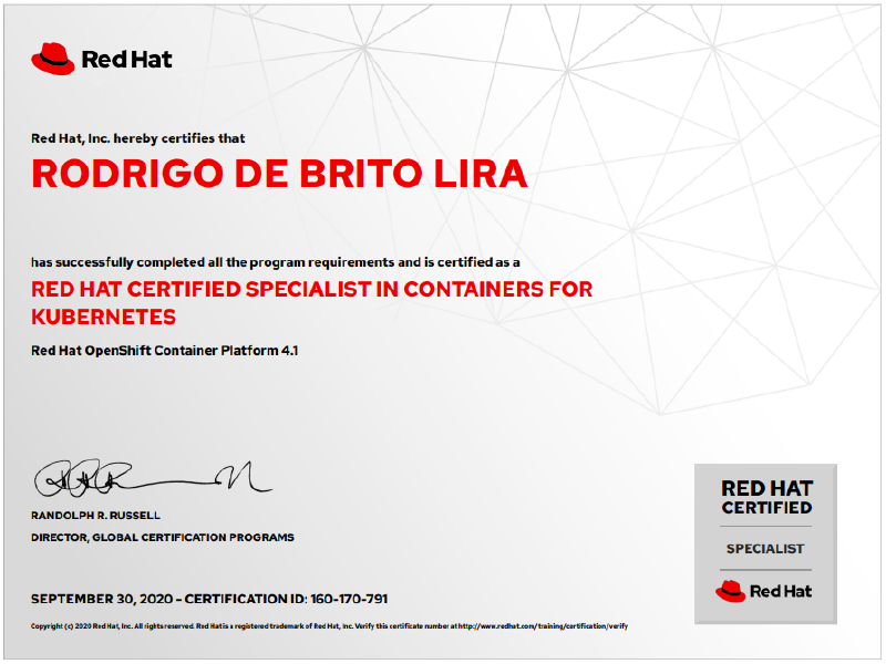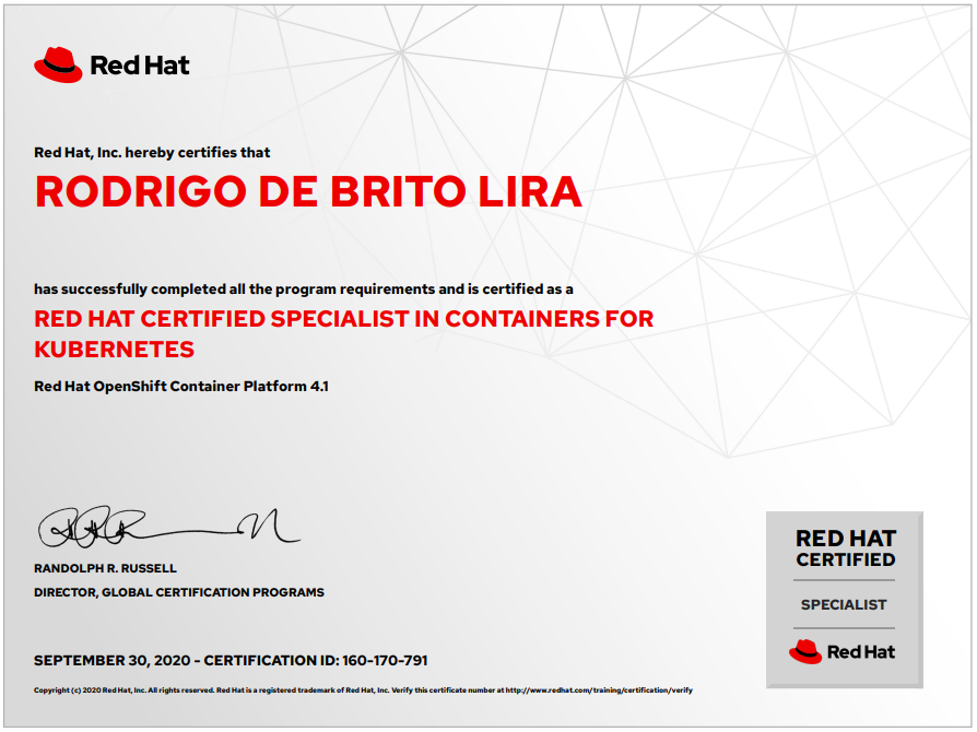 Recentemente passei no Exame Red Hat Certified Specialist in Container for Kubernetes (DO180), esse é o primeiro exame recomendado pela Red hat na trilha de estudos para o OpenShift.