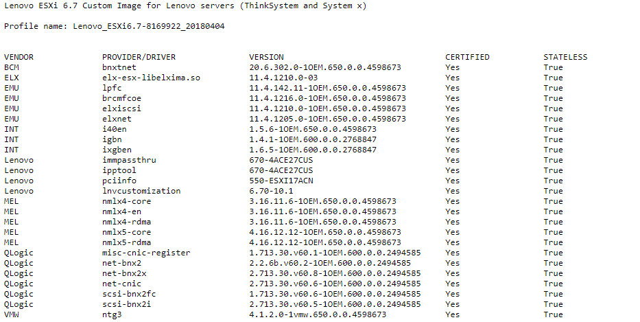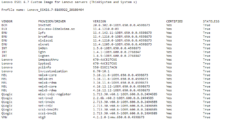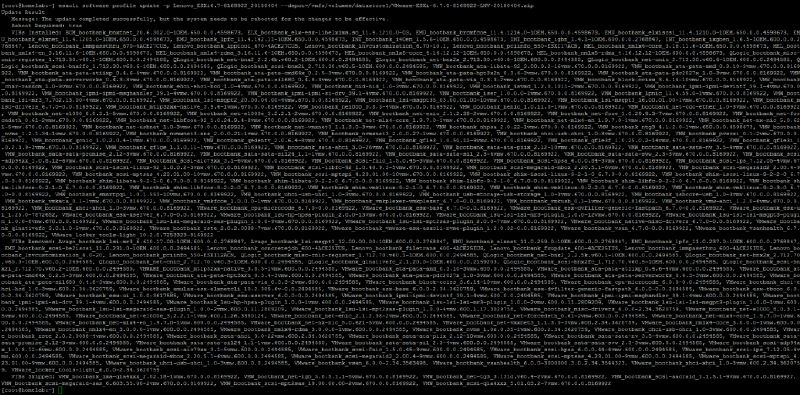 # esxcli software profile update -p Lenovo_ESXi6.7-8169922_20180404 -d /vmfs/volumes/datastore1/VMware-ESXi-6.5.0-4564106-depot.zipDevemos observar o parâmetro -p Lenovo_ESXi6.7-8169922_20180404, que faz referência ao profile de imagem que estamos usando para atualização, no meu caso, a Lenovo informou isso em um readme.txt dentro do mesmo diretório onde baixei os arquivos.