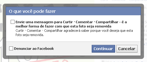 Exitem duas opções, no meu caso escolhi denunciar diretamente ao facebook para que o mesmo resolvesse o problema, click em continuar. Pronto feito isso basta esperar que o próprio facebook resolva o problema.