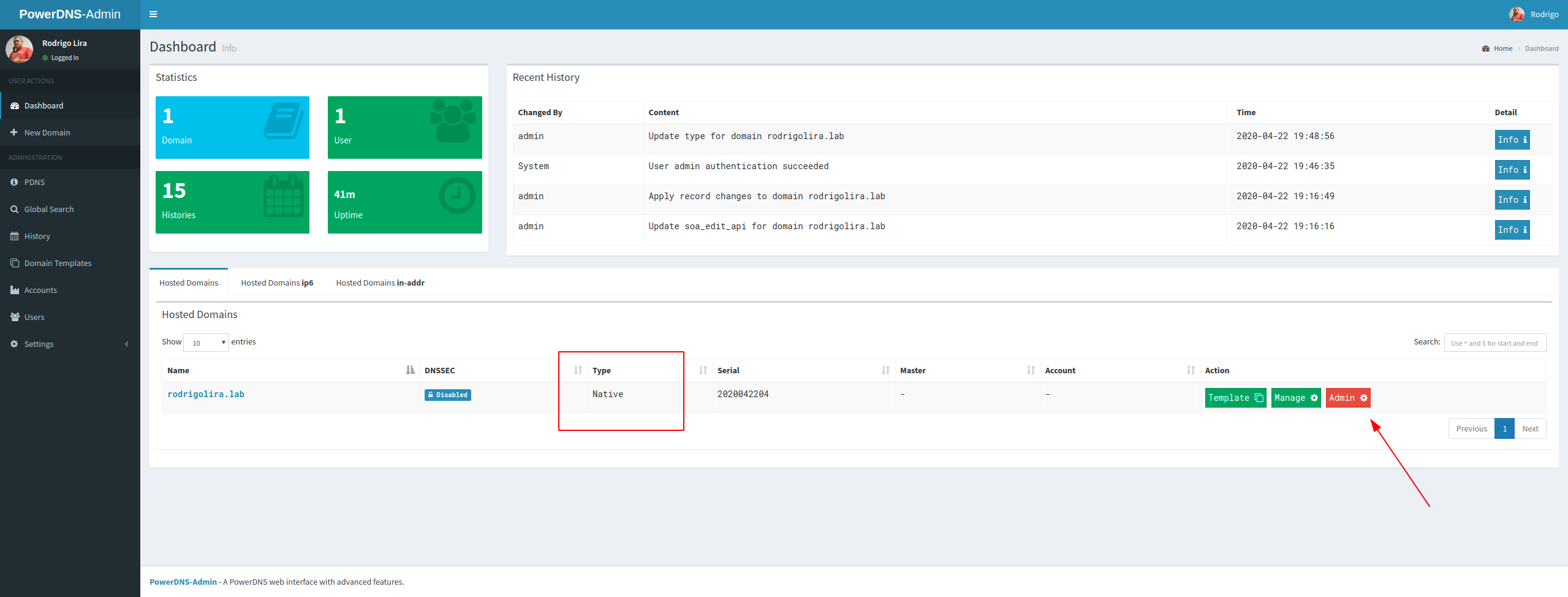 1 - Acesse o PowerDNS-Admin e veja o domínio que deseja configurar, observer que ele já informa o tipo de funcionamento do servidor na coluna Type, clique em Admin para mudarmos.
