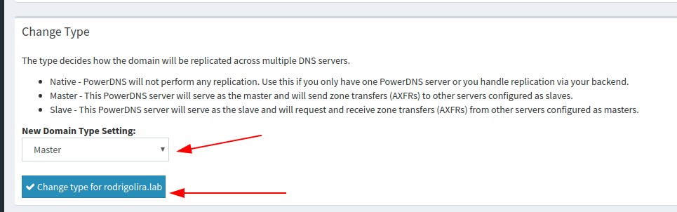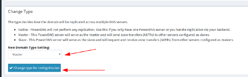 2 - Em Change Type, selecione Master em New Domain Type Setting e depois clique em Change type for SEU DONÍNIO.
