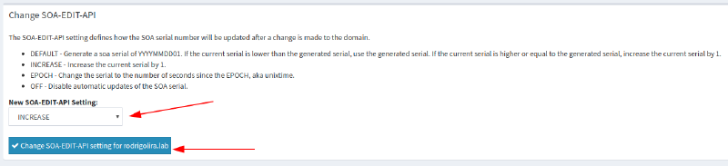 3 - Em Change SOA-EDIT-API, selecione INCRASE em New SOA-EDIT-API Setting para incrementar o serial a cada mudança no domínio e clique em Change SOA-EDIT-API setting for SEU DOMÍNIO.