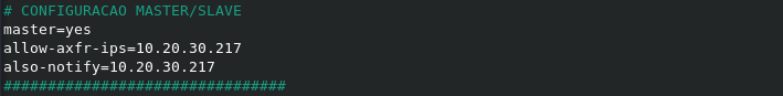 also-notify=10.20.30.217OBS: Substitua os endereços IP pelos endereços IP do seu servidor Slave.