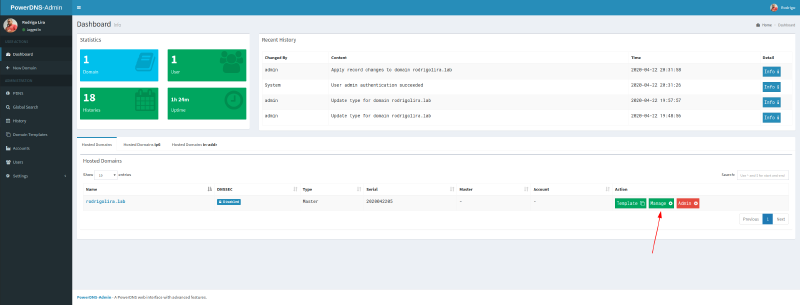 # tail -f -n 0 /var/log/messages | grep pdns_serverAgora acesse o PowerDNS-Admin e clique em Manager no seu domínio.