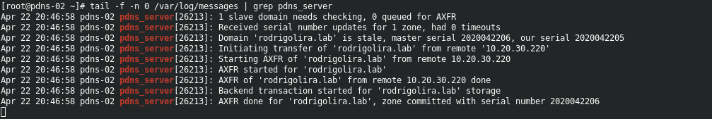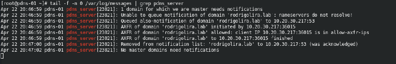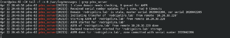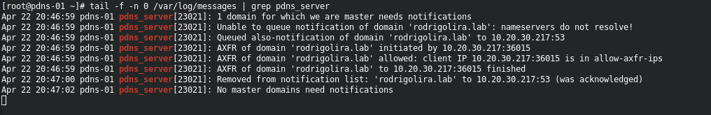 # systemctl restart pdnsPronto, Master e Slave configurados, agora vamos verificar se estão sincronizando as informações corretamente.
