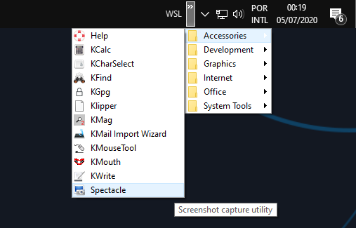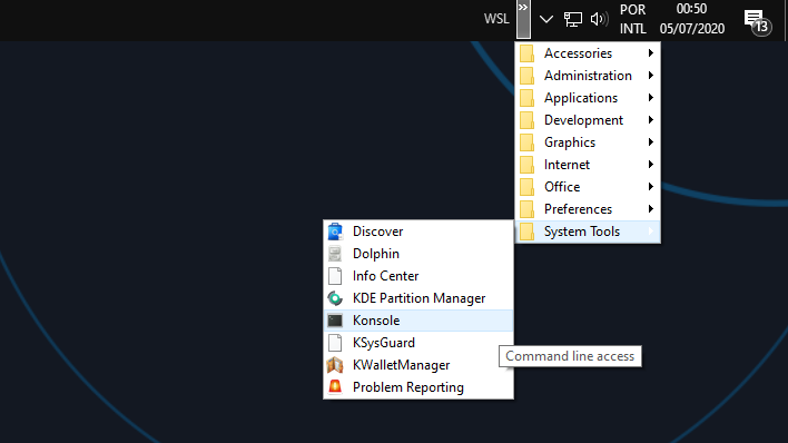 Esse script cria um menu na Barra de Tarefas do Windows baseado no Menu do KDE, como na imagem abaixo: