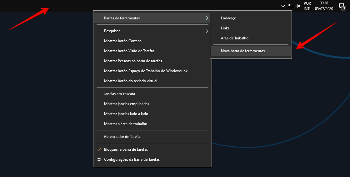 No Windows clique com o botão direito na barra de tarefas, depois navegue até Barra de ferramentas > Nova barra de ferramentas.