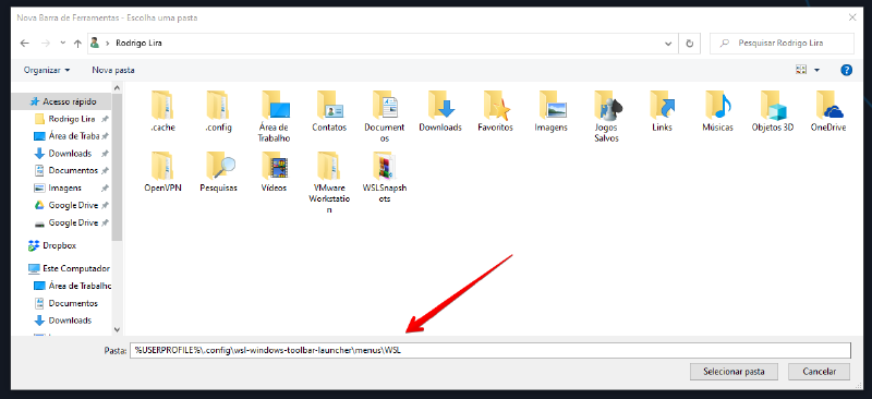 %USERPROFILE%\.config\wsl-windows-toolbar-launcher\menus\WSLE depois clicar em Selecionar pasta.