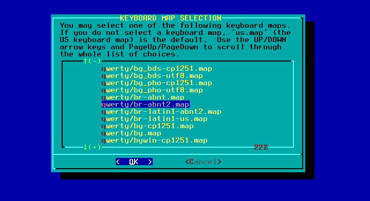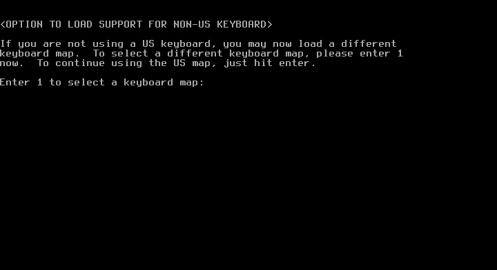 02 - Após dar boot, o sistema irá solicitar que você selecione o teclado desejado, se você usa um teclado que não seja com o padrão US, basta digitar “1” e teclar ENTER que será mostrado um menu com diversos modelos de teclado.