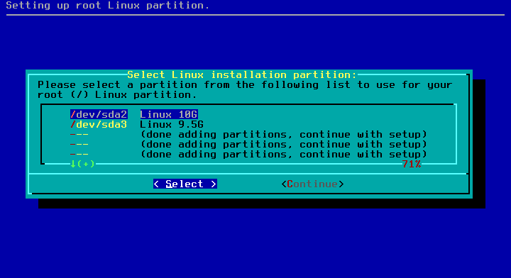 12 - Agora selecione a partição que o sistema será instalado, a partição raiz (/), em nosso caso o /dev/sda2.