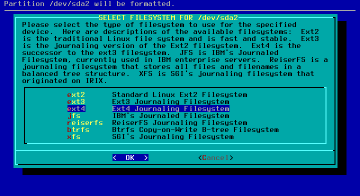 14 - Selecione o sistema de arquivos, nosso caso ext4.