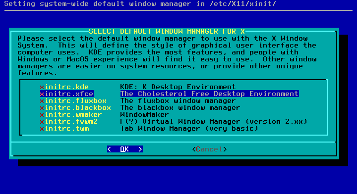 41 - Selecione o ambiente gráfico desejado, vamos deixar como XFCE por enquanto.