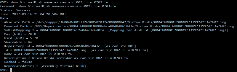 OVM> show VirtualDisk name=as-cam-vir-002-li-ol0703-fwBem, é isso ai, espero que tenham gostado, em caso de dúvidas escreva um comentário.