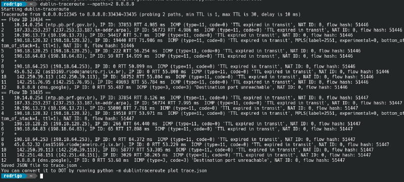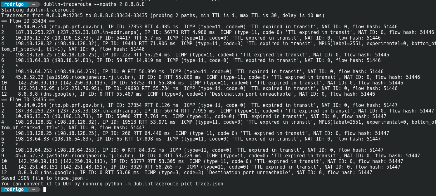 Por padrão o Dublin-traceroute exibe a saída na linha de comando e cria um arquivo json chamado trace.json no diretório local.