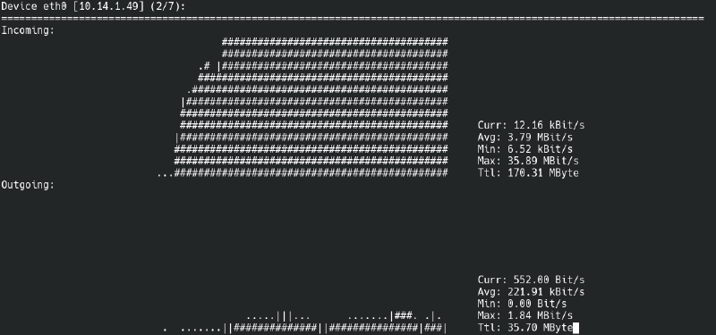O nload exibe em tempo real o uso de suas interfaces de rede.