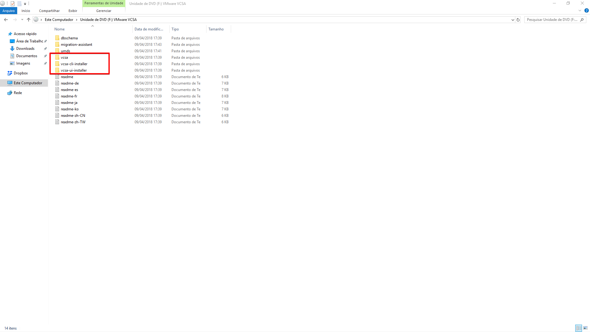 1 - Se estiver usando o Windows 10 como é o meu caso basta montar a ISO do VCSA. Como podemos verificar, existem três pastas com o nome vcsa e cada uma é um tipo de instalação. No nosso caso vamos fazer a instalação via interface.