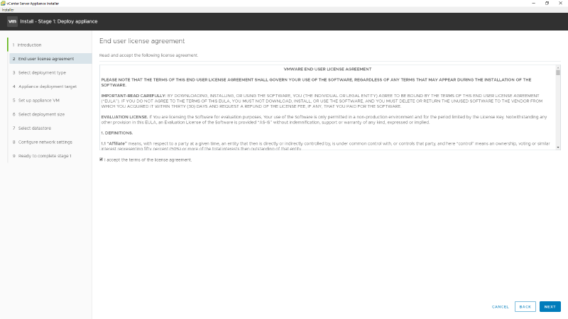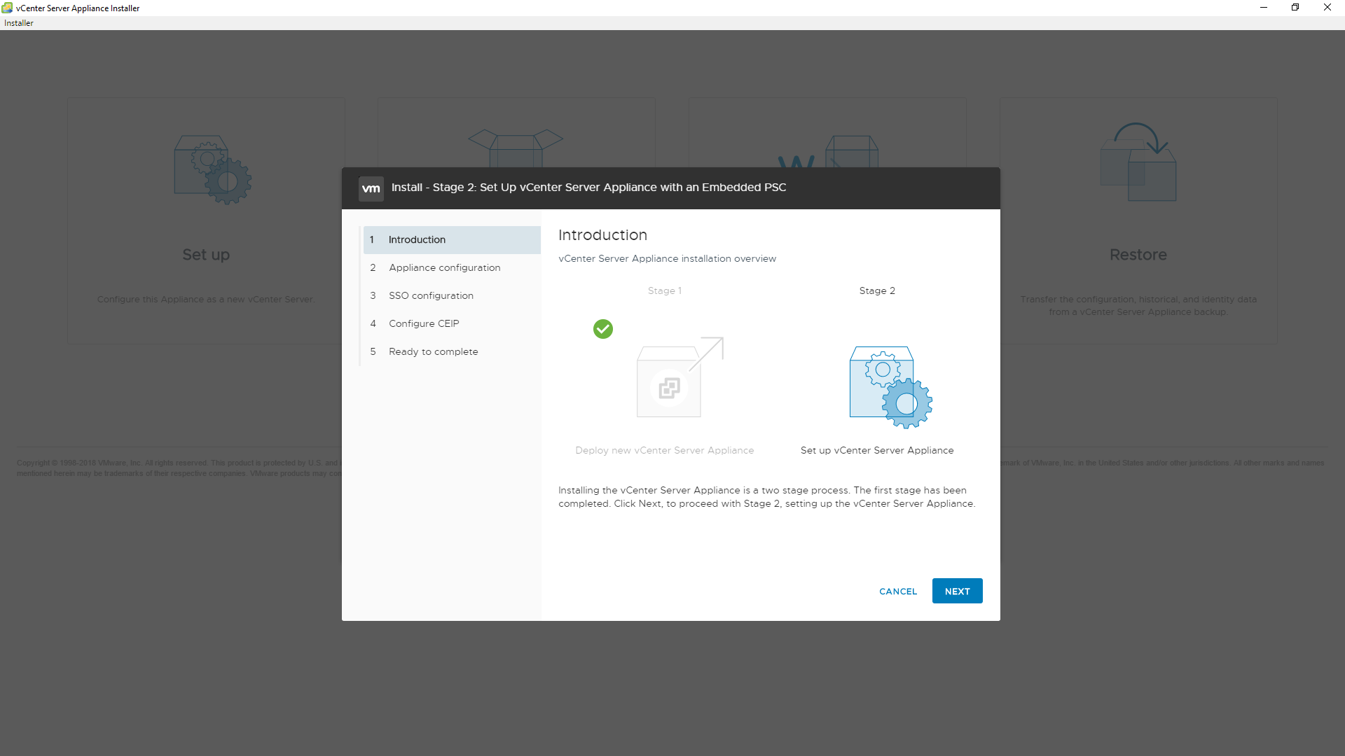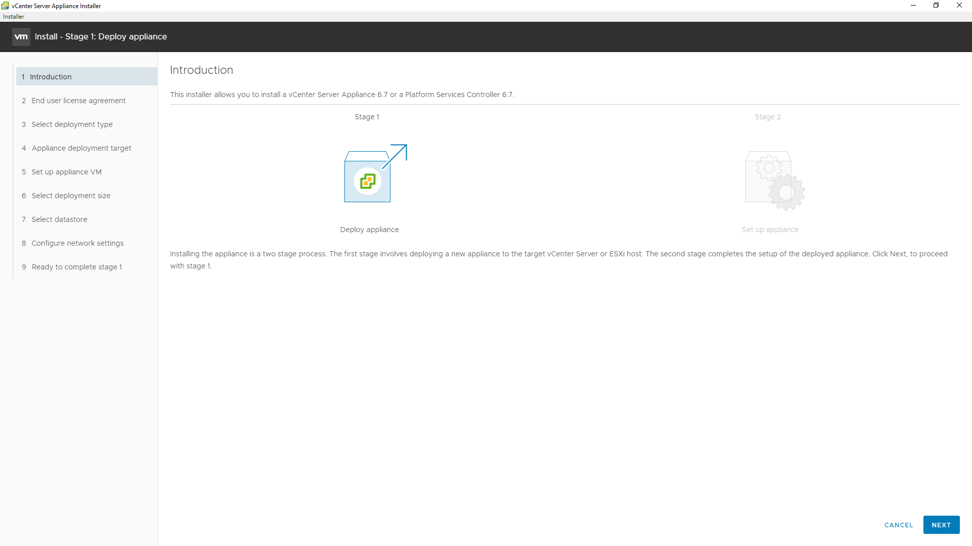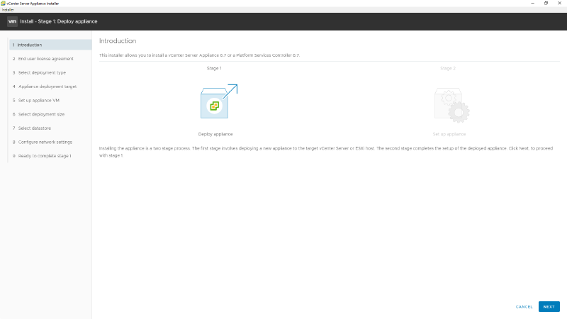 4 - A instalação do VCSA é dividida em dois estágios, o primeira é o deploy e o segundo as configurações, clique em NEXT.