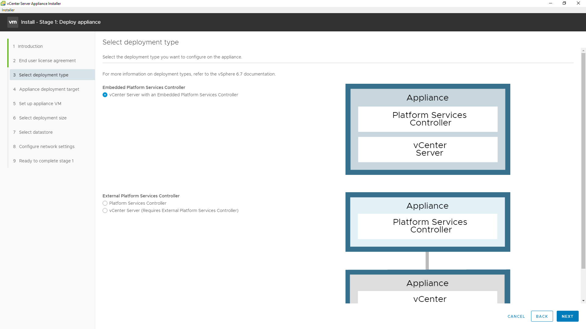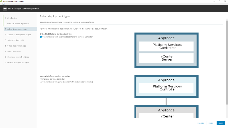 6 - Selecione o tipo de instalação, em nosso caso será a Embedded Plataform Services Controller, selecione e clique em NEXT.