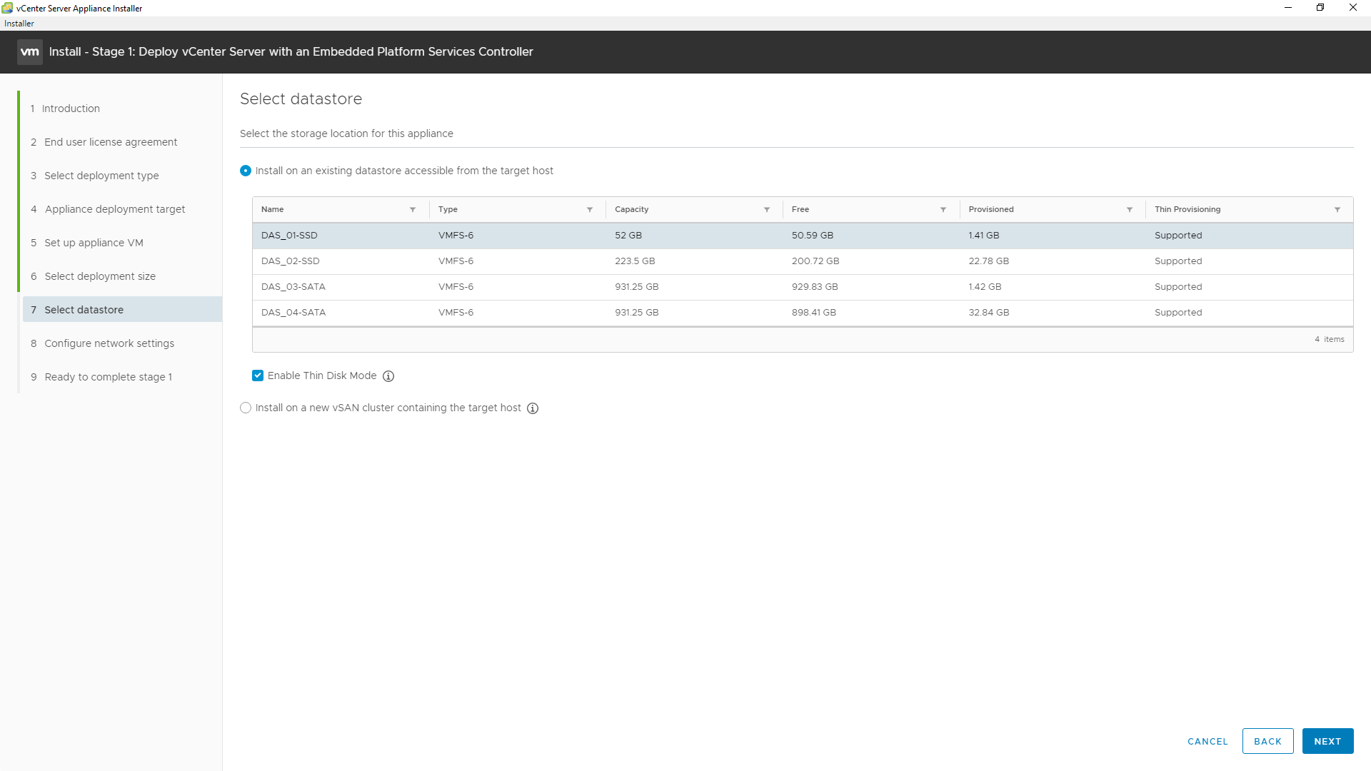 11 - Selecione o datastore de destino, selecione Enable Thin Disk Mode para habilitar o Thin Provisioning para o disco do VCSA, clique em NEXT.