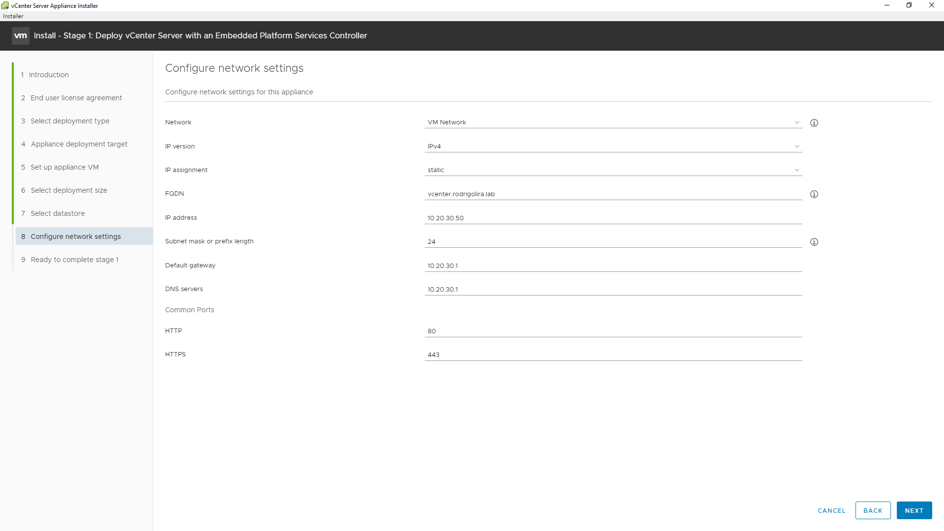 12 - Insira as informações de rede do VCSA, caso deseje usar um FQDN tenha um servidor de DNS bem configurado em seu ambiente, clique em NEXT.
