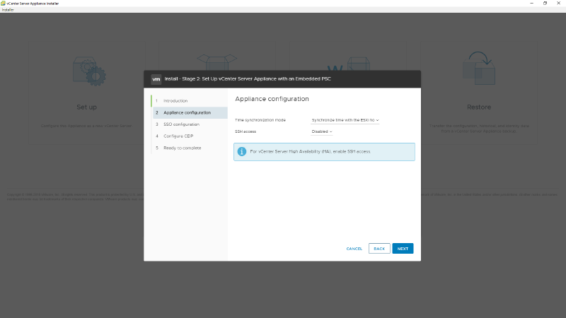16 - Selecione se o VCSA vai sincronizar a hora com o host ESXi, ou se vai usar um servidor NTP, caso opte por um servidor NTP, será necessário digitar as informações do mesmo. Selecione se o acesso via SSH ao VCSA será habilitado ou não, clique em NEXT.