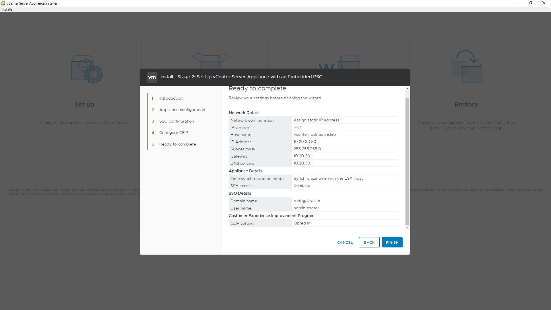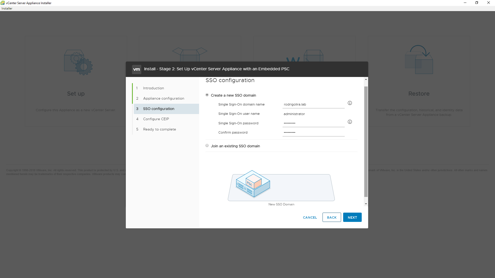 17 - Configure o SSO domain e a senha de acesso ao ambiente do VCSA.