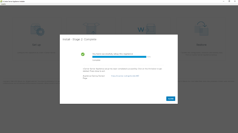 21 - Clique no link para abrir a página do VCSA e depois em CLOSE.