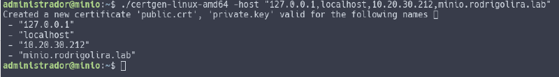 # chmod +x certgen-linux-amd643 - Agora execute o certgen passando os endereços de acesso ao seu minio, no meu caso foi 127.0.0.1, localhost, 10.20.30.212, minio.rodrigolira.lab.