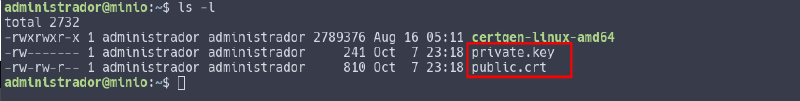 # ./certgen-linux-amd64 -host "127.0.0.1,localhost,10.20.30.212,minio.rodrigolira.lab"Após a execução do certegn é gerado dois arquivos, private.key e public.crt.