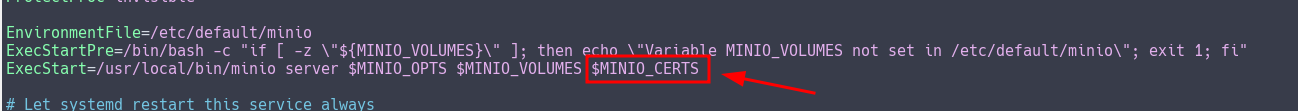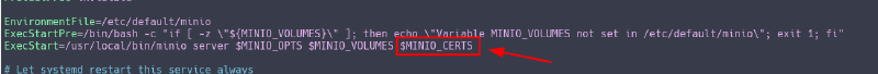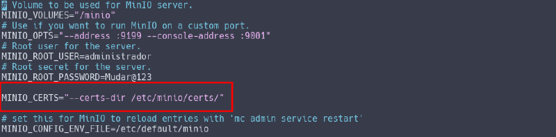 MINIO_CERTS="--certs-dir /etc/minio/certs/"8 - Agora edite o arquivo /etc/systemd/system/minio.service e adicione a variável $MINIO_CERTS ao final da linha que inicia com o ExecStart.