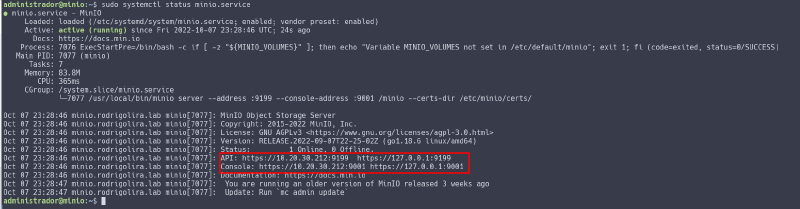 # systemctl daemon-reload# systemctl restart minio.service10 - Verifique o status do serviço, observe que o serviço agora mostra https na url.
