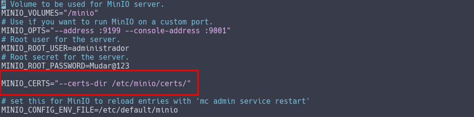 MINIO_CERTS="--certs-dir /etc/minio/certs/"8 - Agora edite o arquivo /etc/systemd/system/minio.service e adicione a variável $MINIO_CERTS ao final da linha que inicia com o ExecStart.