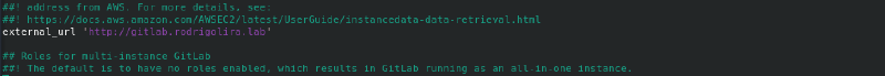 external_url 'http://gitlab.rodrigolira.lab'OBS: Não esqueça de criar a entrada para o GitLab em seu DNS.
