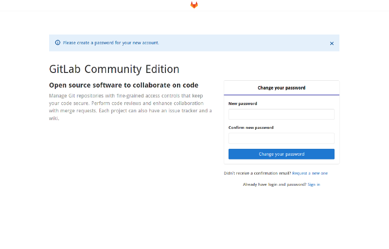 # gitlab-ctl reconfigure8 - Depois de reconfigurar o acesso web já vai estar disponível, quando você abrir o GitLab em seu navegador será solicitado criar uma senha.