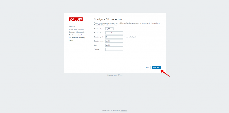 # mysql -u root -pMudar123 -e "grant all on zabbix.* to zabbix@localhost identified by 'Mudar123';" (cria o usuário e da as permissões no banco zabbix, mude o Mudar123 para a senha que você desejar)