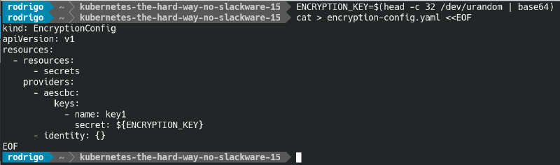 Dando continuidade a nossa serie de posts Kubernetes The Hard Way no Slackware 15, esse post é bem curto, vamos gerar uma chave e a configuração de criptografia para criptografar os dados do Kubernetes.