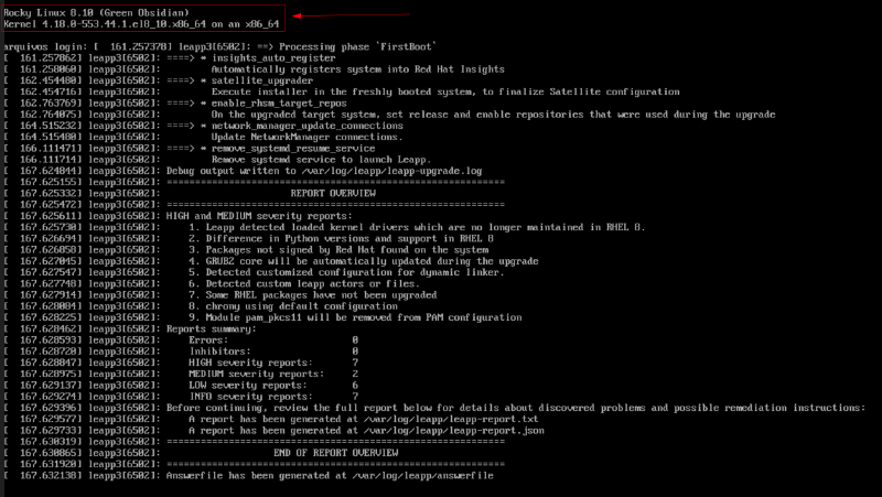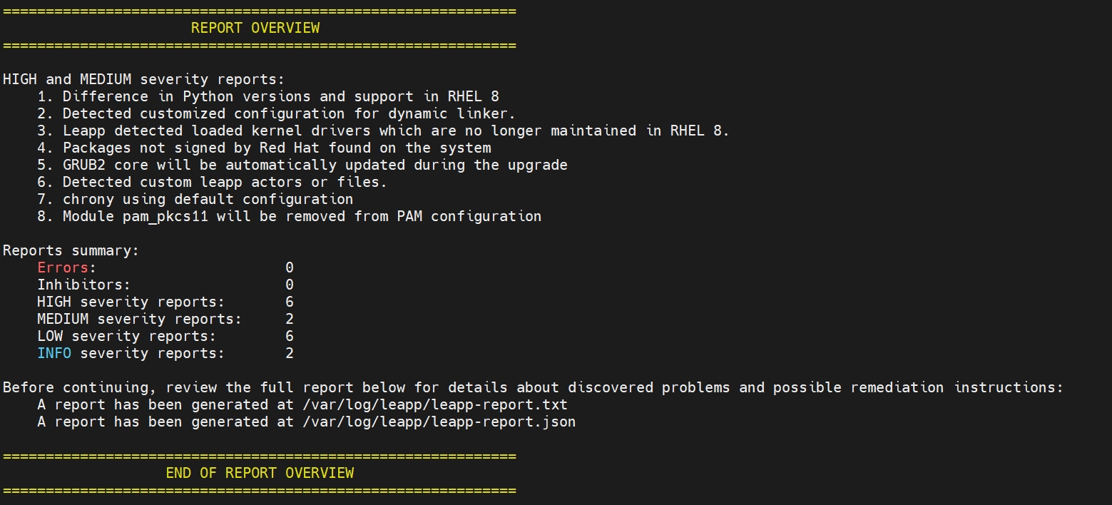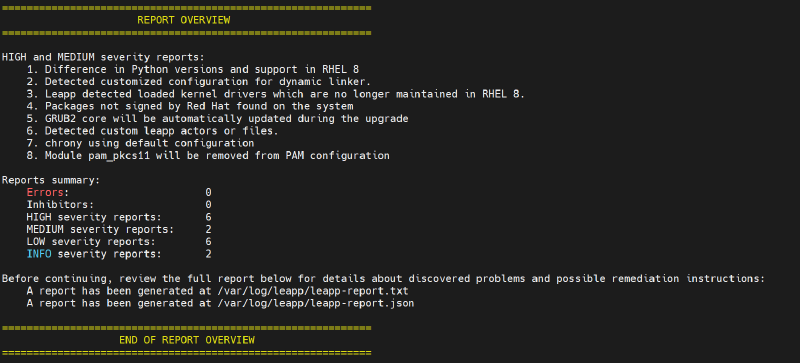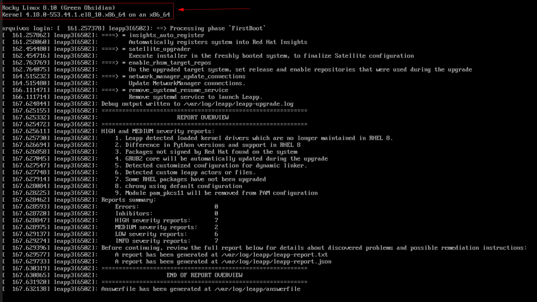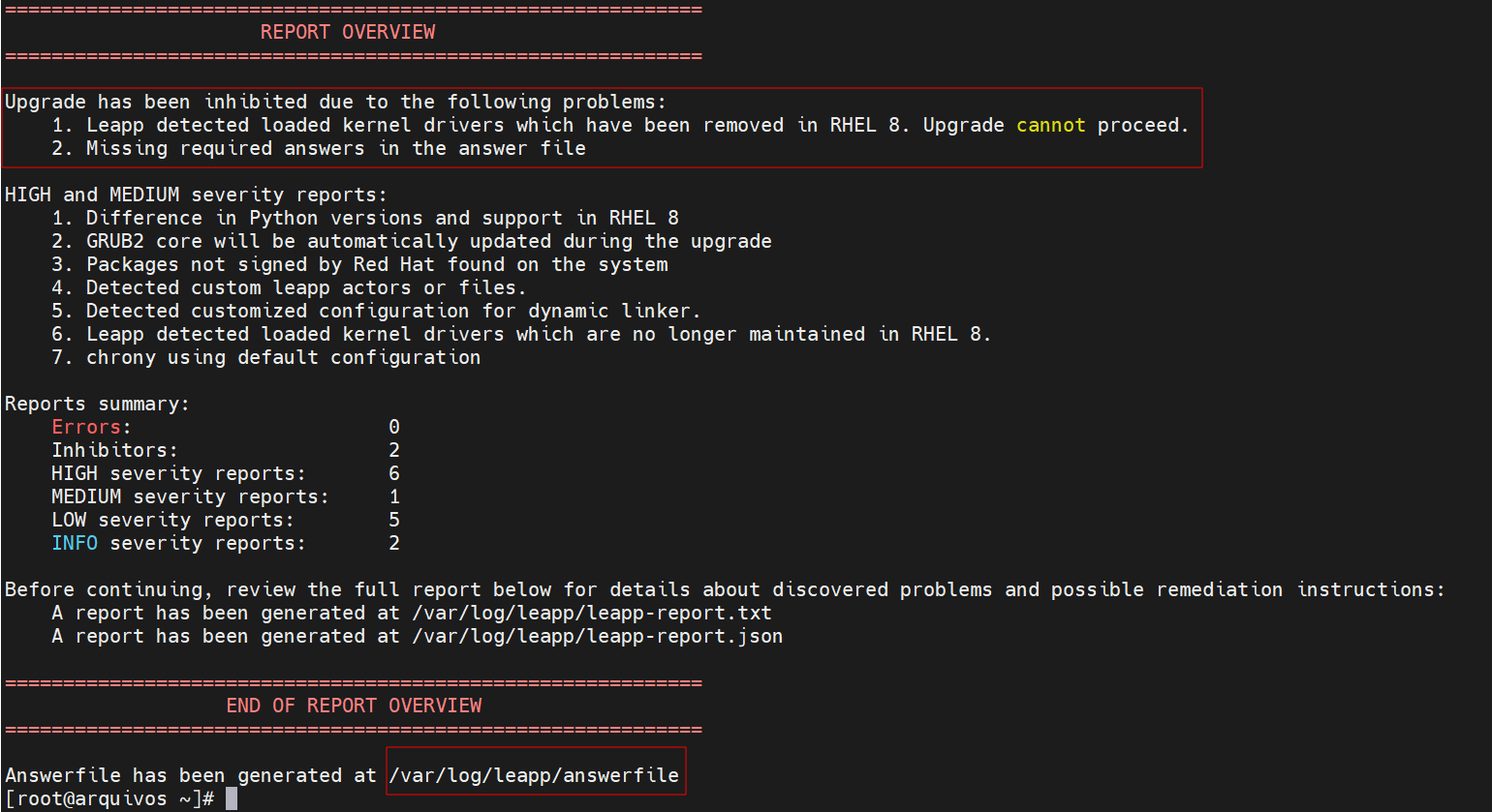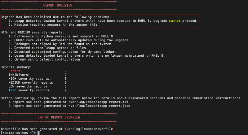 Ao final, ele vai gerar alguns arquivos no diretório /var/log/leapp/, esses arquivos contêm todos os possíveis problemas com atualização e como corrigir esses problemas.