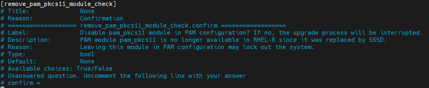 # leapp answer --section remove_pam_pkcs11_module_check.confirm=TrueVeja na imagem abaixo como fica o arquivo após a execução do comando acima.