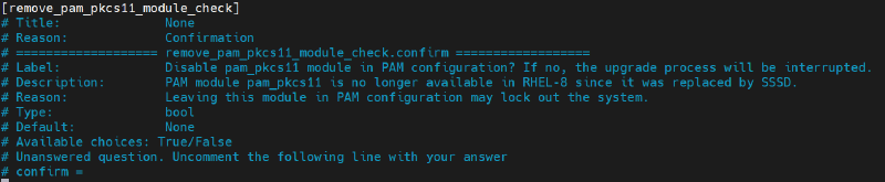 # rmmod pata_acpiE o segundo, nós precisamos responder as questões do arquivo /var/log/leapp/answerfile, no meu caso ele vai desabilitar o módulo o pam_pkcs11 do PAM.