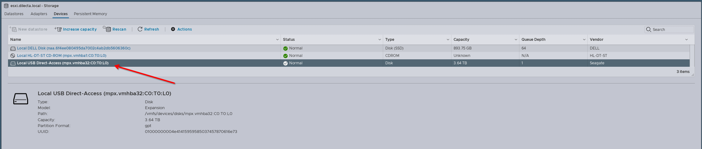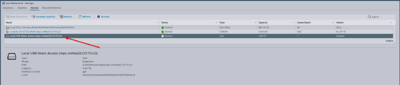 # chkconfig usbarbitrator off3 - Acessando a interface web do ESXI, indo em Storage > Devices, podemos verificar o disco, observe que ele aparece com o nome Local USB Direct-Access, o que facilita na identificação de qual disco desejamos formatar, no meu caso é o mpx.vmhba32:C0:T0:L0.