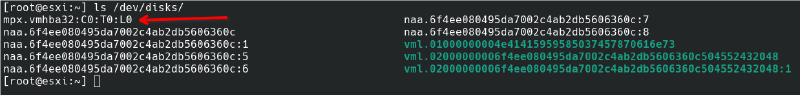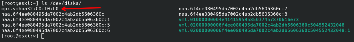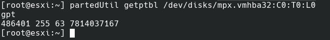 # partedUtil getptbl /dev/disks/mpx.vmhba32:C0:T0:L0