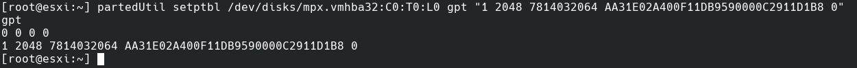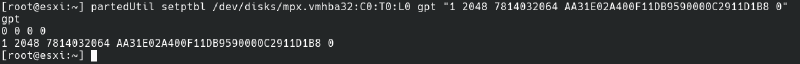 # partedUtil setptbl /dev/disks/mpx.vmhba32:C0:T0:L0 gpt "1 2048 7814032064 AA31E02A400F11DB9590000C2911D1B8 0"O código AA31E02A400F11DB9590000C2911D1B8 é o código para o tipo de sistemas de arquivos VMFS.