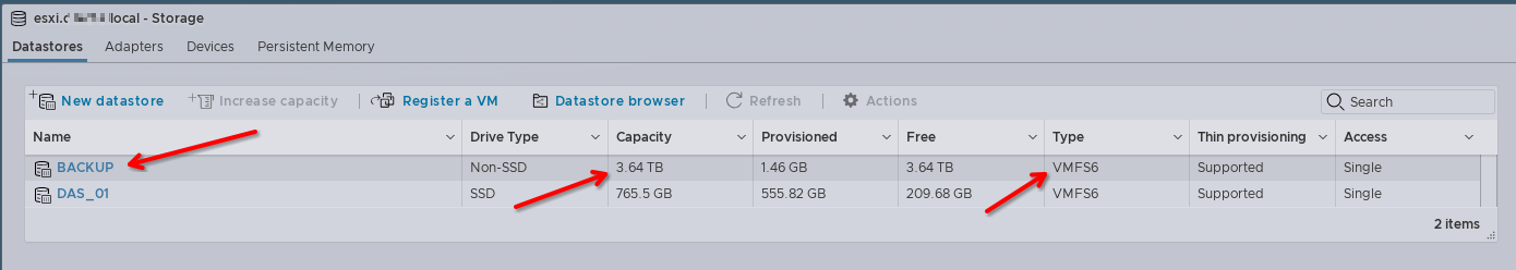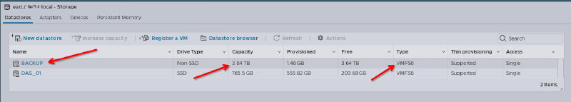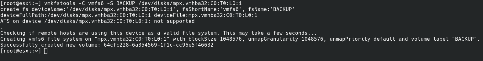 #vmkfstools -C vmfs6 -S BACKUP /dev/disks/mpx.vmhba32:C0:T0:L0:1BACKUP foi o nome que eu escolhi para montar o disco no datastores, você pode usar qualquer nome.