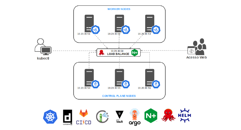 Como vocês podem ver na imagem acima, temos o desenho de uma arquitetura de um cluster kubernetes e algumas logos de ferramentas abaixo.