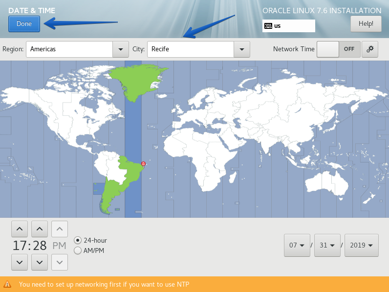 04 - Selecione sua região, no meu caso como não tem João Pessoa/PB uso Recife, se desejar pode configurar os servidores NTP e clique em Done.