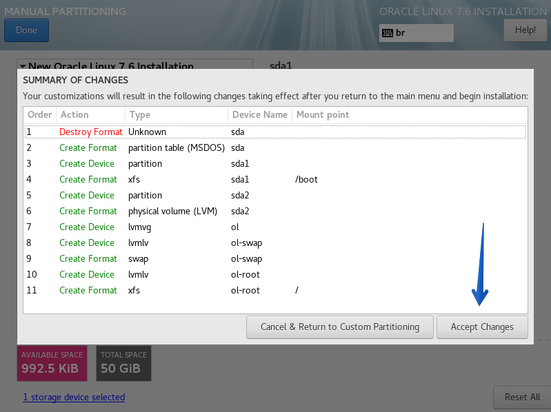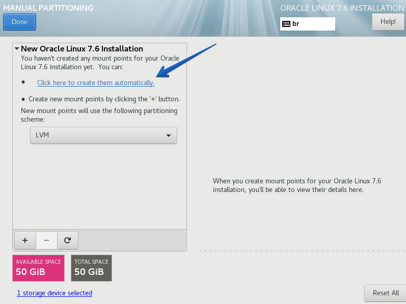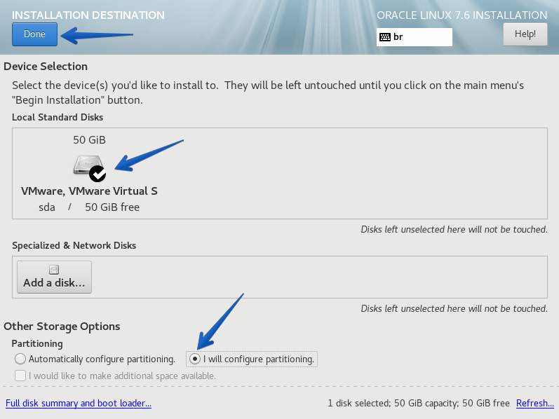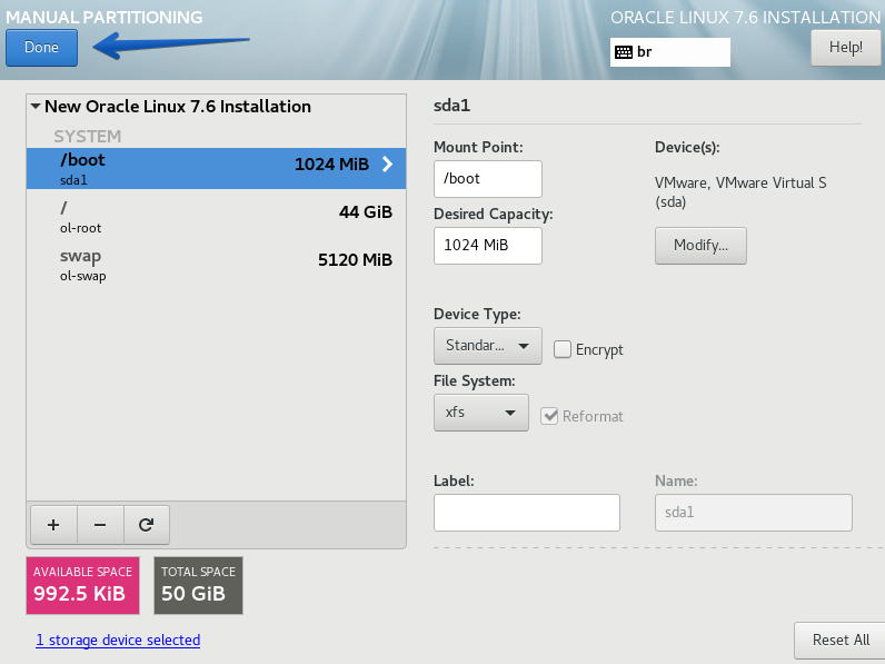 13 - Por padrão o Oracle Linux irá criar três partições para esse tamanho de disco, clique em Done.